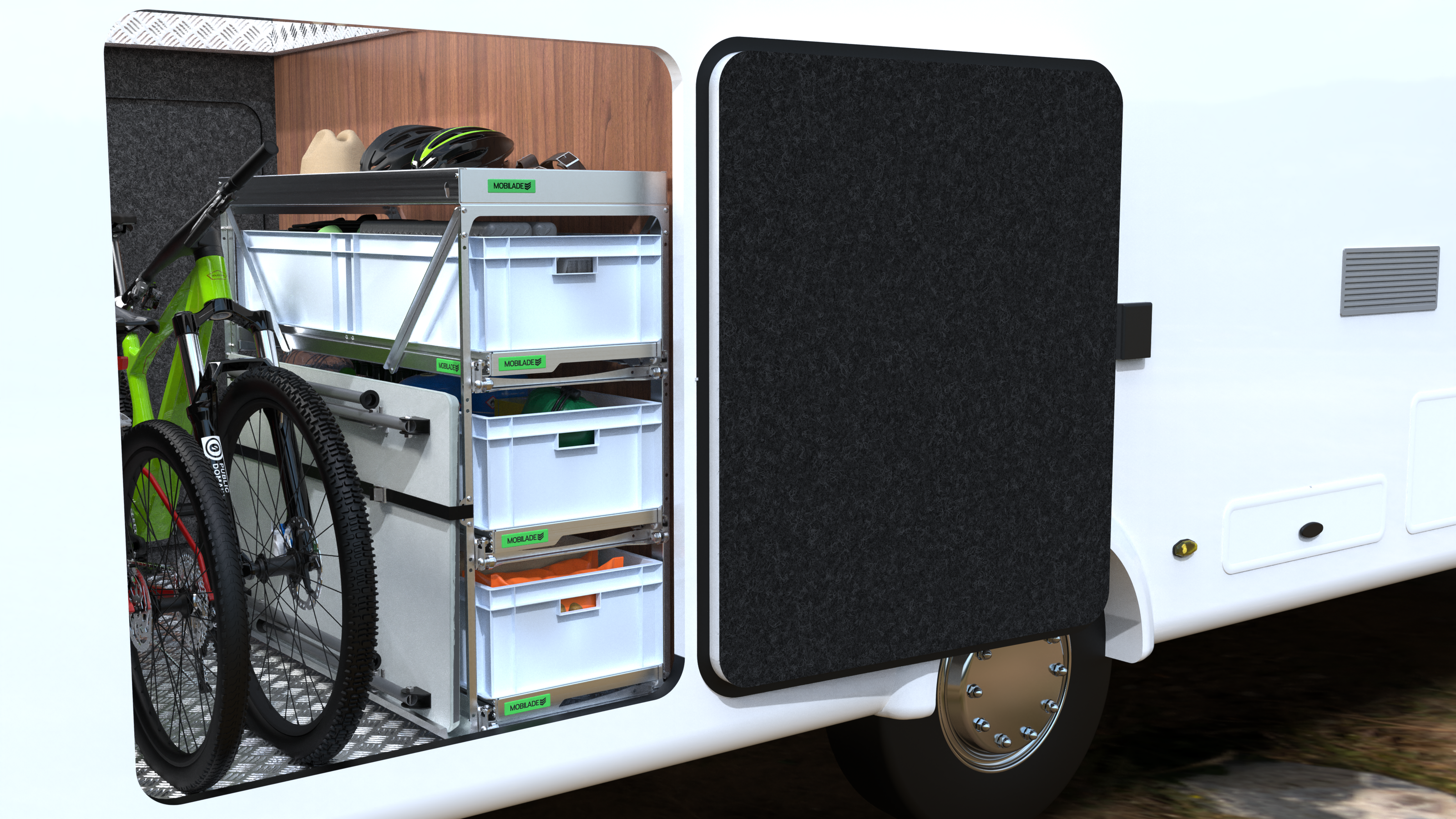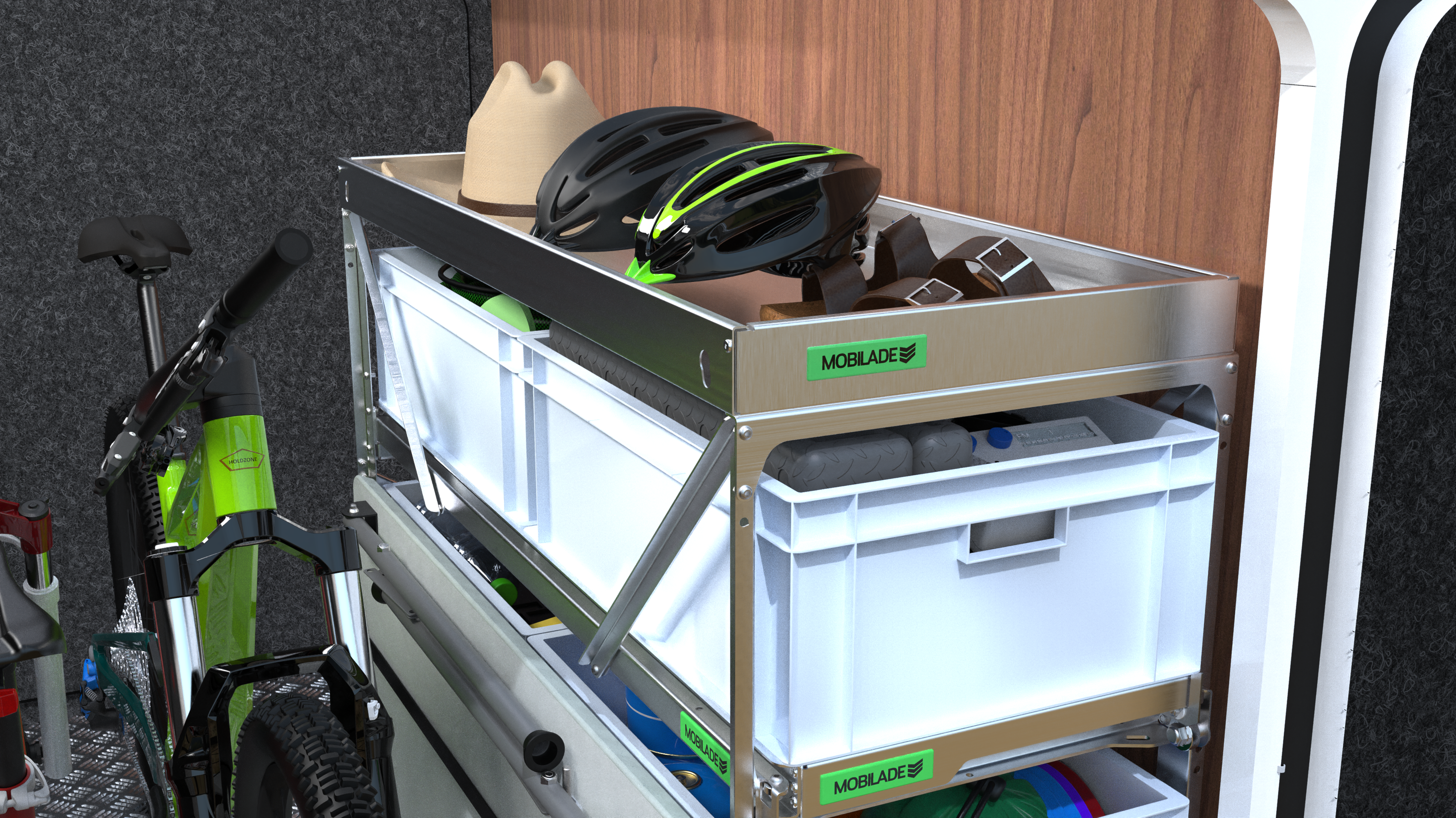 Nuestras cajoneras extralargas sobresalen mucho del vehículo. Así, por fin no tendrá que meterse en el garaje trasero. Con una Mobilade puede acceder fácil y cómodamente a todo desde fuera.
