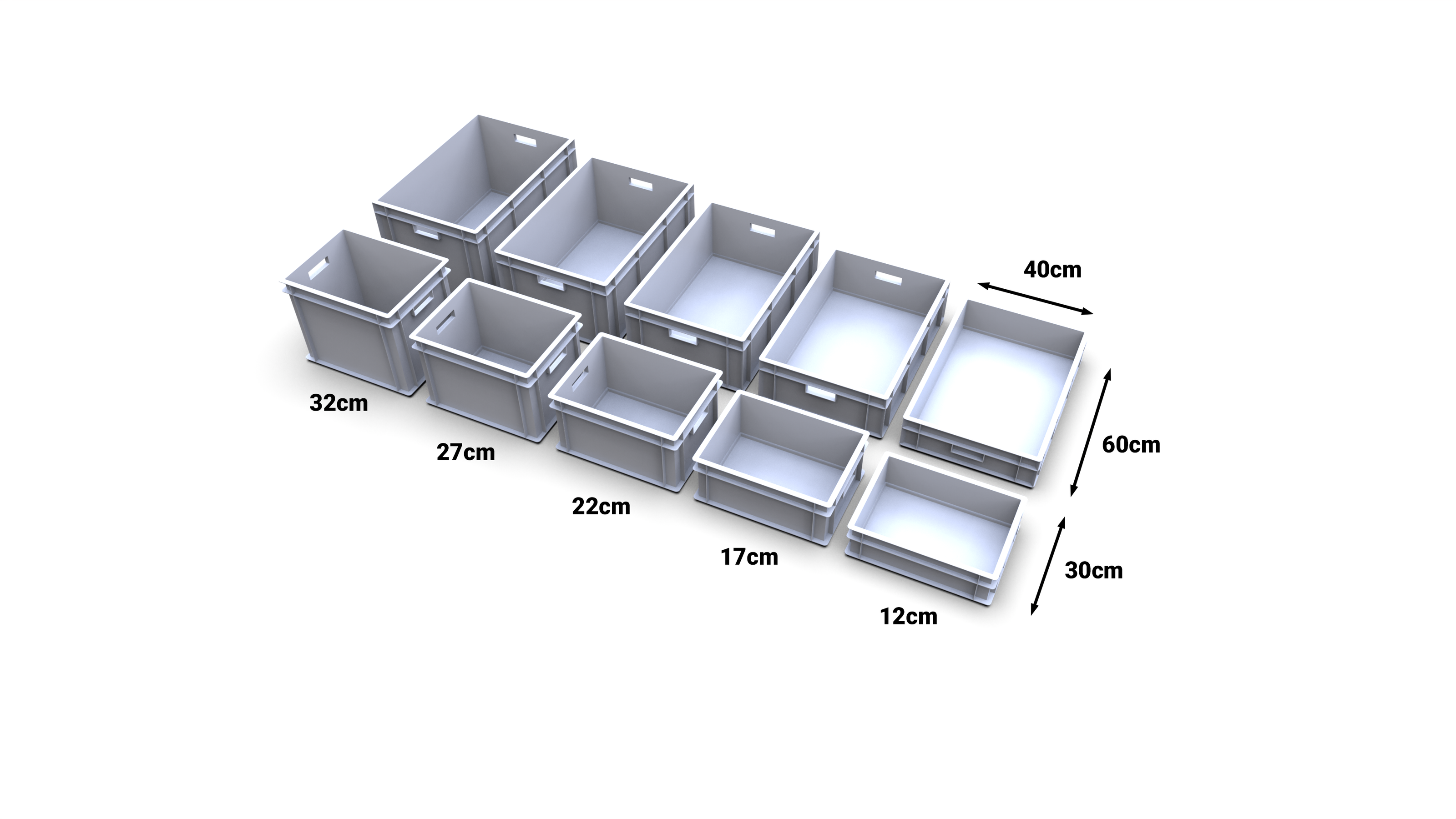 Cajas Euro-Norma con las dimensiones base de 30x40 cm y 40x60 cm. Existen de muchos fabricantes, pero todas son compatibles entre sí.